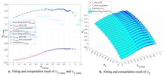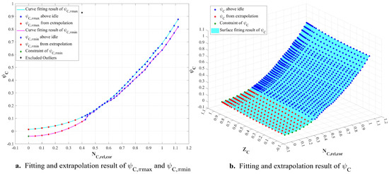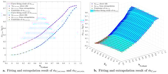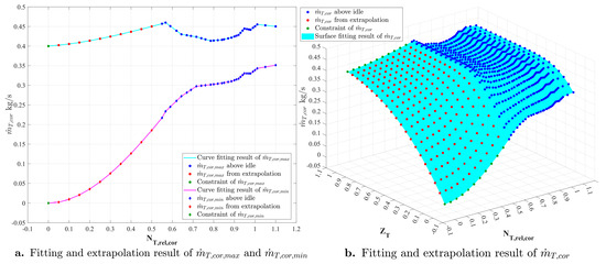 Regarding the micro-turbojet engine in this study, the PCHPI method was applied to perform curve fitting and extrapolation for both maximum and minimum corrected mass flow rates above idle speed, the results are plotted in Figure 5a. Due to the lack of experimental data, the maximum corrected mass flow rate at zero speed remains undetermined; to ensure smoothness of the extrapolated results, it was conservatively assigned a value of 0.1 kg/s.