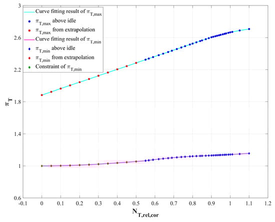 Step 1: Fit the curves of the maximum and minimum pressure ratios above idle as a function of the relative corrected speed. The fitting relationships are given by Equations (37) and (38), and the maximum and minimum pressure ratios below idle are extrapolated from the fitting results.