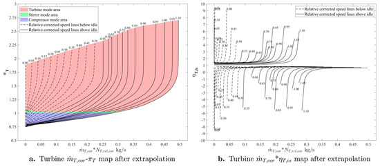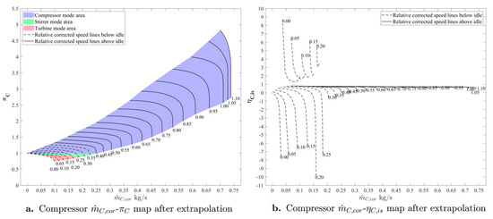 - Gaudet, S.R.; Gauthier, J.E.D. A Simple Sub-Idle Component Map Extrapolation Method. In Proceedings of the ASME Turbo Expo 2007: Power for Land, Sea, and Air, Montreal, QC, Canada, 14–17 May 2007; Volume 1: Turbo Expo 2007, pp. 29–37. [Google Scholar]