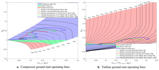 Under normal operating conditions, the compressor performs work on the airflow, increasing the total temperature and pressure of the gas, while the turbine extracts work from the gas flow, resulting in decreased total temperature and pressure. However, multiple research institutions and scholars, including NASA Lewis Research Center [19,20,21] and Dr. Kurzke (author of GasTurb) [27,28,30,33], have consistently observed that during aeroengine windmilling conditions or at very low rotational speeds, both compressors and turbines may significantly deviate from their design states. Remarkably, the total temperature and pressure may even decrease after passing through the compressor, while increasing after the turbine in these abnormal conditions. This evidence clearly demonstrates that comprehensive analysis of compressor and turbine operational characteristics across the full operating envelope must precede any component characteristic extrapolation [3].