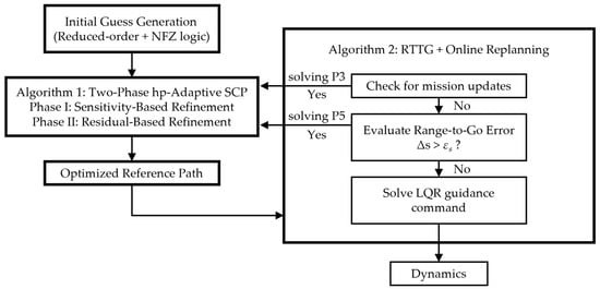 By formulating trajectory planning as an optimal control problem (OCP), one can enforce entry-phase constraints while optimizing performance indices [,,,,]. This dual capability of rigorous constraint satisfaction and performance optimization distinguishes OCP-based methods from traditional trajectory-planning approaches. Numerical OCP solvers are classified into two categories: indirect methods—which derive Pontryagin-based necessary conditions but suffer from sensitivity to initial guesses and difficulty handling complex constraints—and direct methods, which transcribe the OCP into a finite-dimensional nonlinear program (NLP) for robust constraint enforcement via mature solvers. Among direct approaches, pseudospectral techniques [,,] attain high-fidelity state/control approximations for offline design but incur prohibitive computational overhead when applied online, owing to high dimensionality and non-convexity.