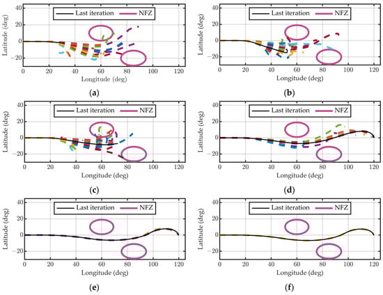 To further visualize the effect of different initial guesses, Figure 10 presents the ground-track projections of all five initialization strategies, along with the resulting optimized trajectories for the converged cases (A–D). While the initial guesses vary significantly—particularly in the degraded and straight-line cases—the converged solutions successfully redirect the vehicle toward the target while ensuring avoidance of all NFZs. Although the optimized trajectories differ in shape and constraint clearance margins, they all satisfy the terminal conditions and demonstrate successful guidance to the target region. The straight-line initialization (Case E) failed to converge, and therefore no optimized trajectory is shown for that case.