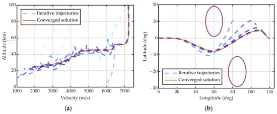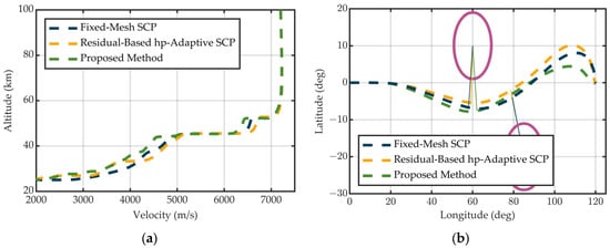 All three methods are evaluated under identical initial and terminal conditions, with consistent convergence criteria based on the maximum relative discretization error. Their resulting trajectories are shown in Figure 11, including altitude–velocity profiles and ground-track projections.