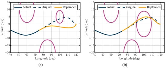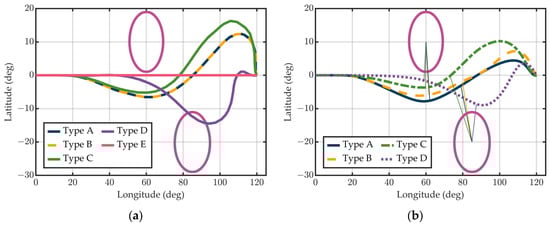 Ground-track comparison of initial guesses and optimized trajectories: (a) initial guesses and (b) optimized trajectories.