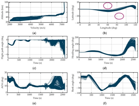 Results in dispersed cases: (a) Altitude vs. velocity, (b) ground track (longitude-latitude), (c) flight-path angle vs. time, (d) heading angle vs. time, (e) AOA vs. time, and (f) bank angle vs. time.