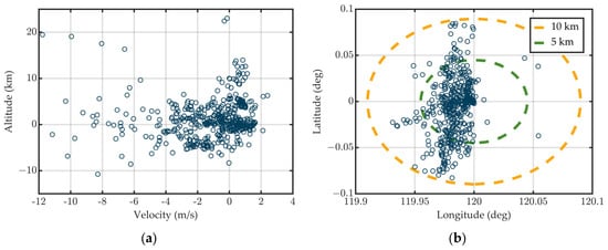 To probe the algorithm’s robustness, we injected simultaneous, zero-mean Gaussian perturbations (3-sigma limits listed in Table 6) into the initial state, atmospheric density (multiplicative bias), vehicle mass, and lift/drag coefficients. A 500-shot Monte Carlo campaign was run. The simulation results are shown in Figure 12. Algorithm 1 generated feasible reference trajectories in all 500 runs; no convex-solver or convergence failures occurred.