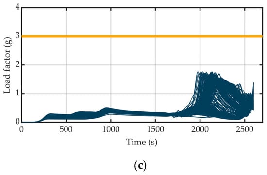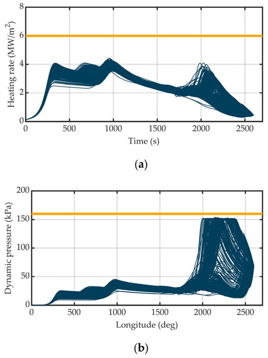 Path constraints in dispersed cases: (a) heating rate, (b) dynamic pressure, and (c) load factor.