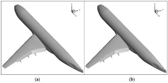 Comparison of the geometry between the CRM-HL baseline model and the CRM-HL modified model. (a) CRM-HL baseline model; (b) CRM-HL modified model.