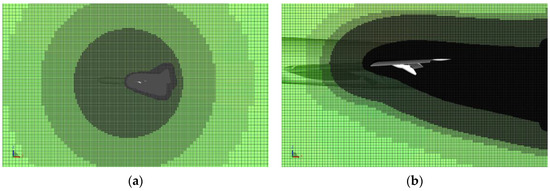 Figure 3 illustrates the Cartesian mesh that has been generated for the CRM-HL baseline model. This grid contains a total of 12 levels of variable resolution. The finest mesh has been generated around the aircraft model, with the minimum size of mesh being approximately 0.386 mm. This is specifically designed to accurately resolve the boundary layer and wake flow. From the aircraft model’s solid surface, the mesh density gradually increases towards the far field. The entire computational domain comprises approximately 120 million elements.