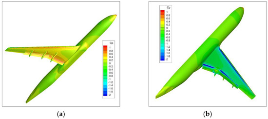 Pressure coefficient distribution on the pressure surface and suction surface at the CRM-HL baseline model at the angle of attack of 3 degrees. (a) Pressure surface; (b) suction surface.