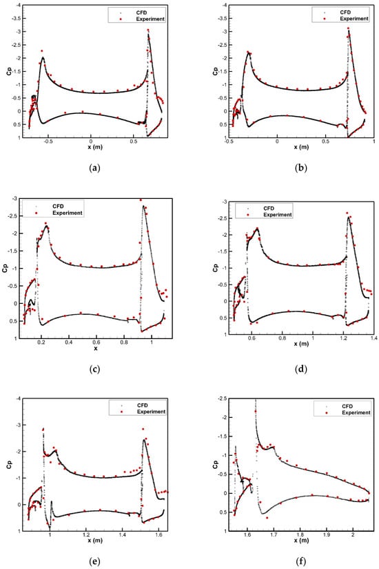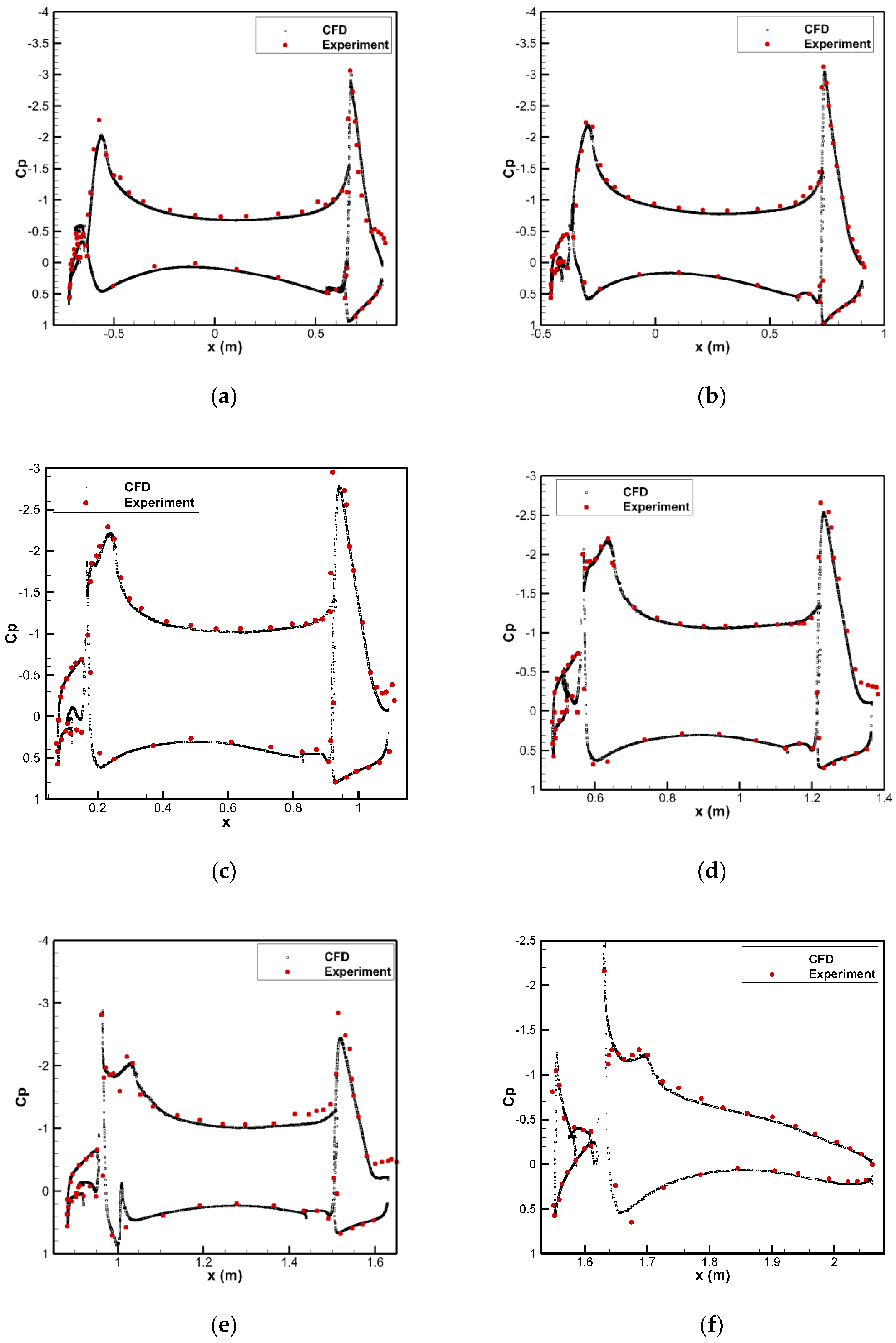 In the present study, a rigorous comparison is undertaken between the numerically computed surface pressures and the experimental measurements [49]. Figure 5 illustrates the predefined planar cuts utilized in the experiment setup [49]. The parameter , defined as the spanwise direction normalized by the total semispan length, serves as a common reference for this comparison. As evident from the data presented in Figure 6, the agreement between the experimental data and CFD results is remarkably satisfactory across all the spanwise stations, validating the accuracy of the numerical simulations.