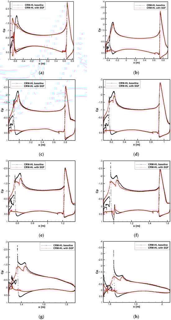 Figure 11 presents a comparative analysis of the surface distribution along eight cuts on the wing, as previously illustrated in Figure 5. Overall, the implementation of the SGF has resulted in a reduction in the distribution across the wing surfaces. However, a notable exception is observed at cut A, situated proximate to the root of the wing. Here, the SGF slightly increased the distribution on the suction surface of the slat. Additionally, the SGF has contributed to an increase in the distributions on the flap surface.