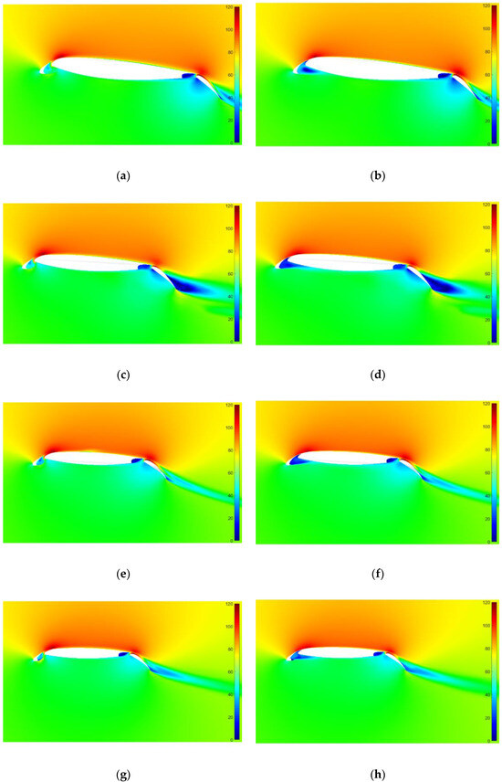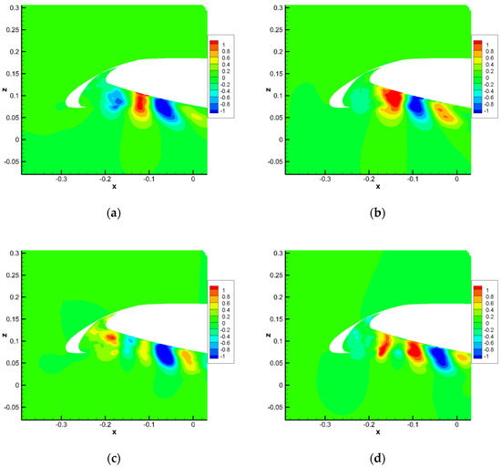 Figure 15 presents a comparative analysis of the surface pressure fluctuation rate distribution across eight distinct cuts on the wing, as initially depicted in Figure 5. Overall, the incorporation of the SGF has led to a significant reduction in the surface distribution on both the slat surface and the main wing surfaces. Conversely, the SGF has induced an increase in the distributions on the flap surface.