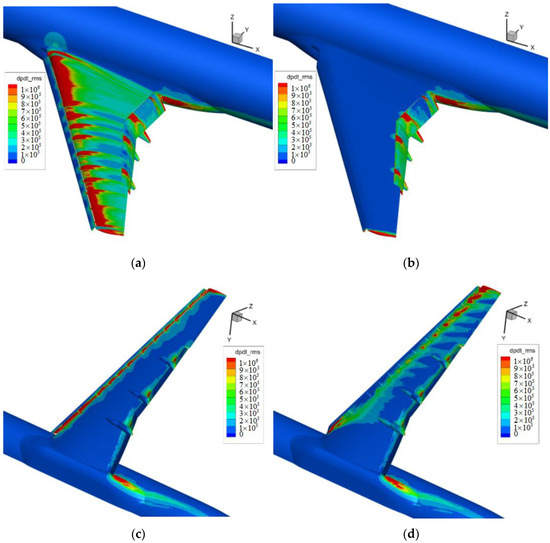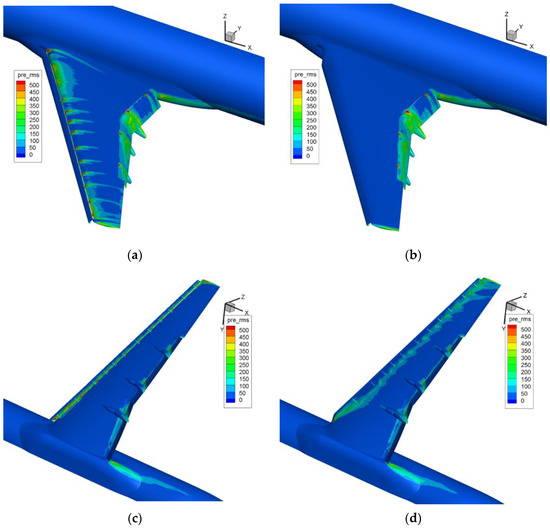 Comparison of the (dp/dt)rms distribution on the airframe between the CRM-HL baseline model and the CRM-HL modified model with slat gap filler. (a) CRM-HL baseline model; (b) CRM-HL modified model; (c) CRM-HL baseline model; (d) CRM-HL modified model.