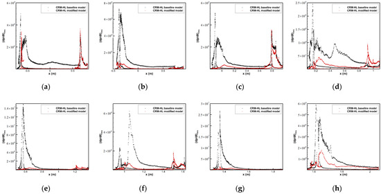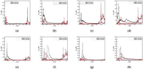 Comparison of the (dp/dt)rms between the CRM-HL baseline model and the CRM-HL modified model at eight cuts at Ma = 0.2 and AoA = 3 deg. (a) Slice A; (b) Slice B; (c) Slice C; (d) Slice D; (e) Slice E; (f) Slice F; (g) Slice G; (h) Slice H.
