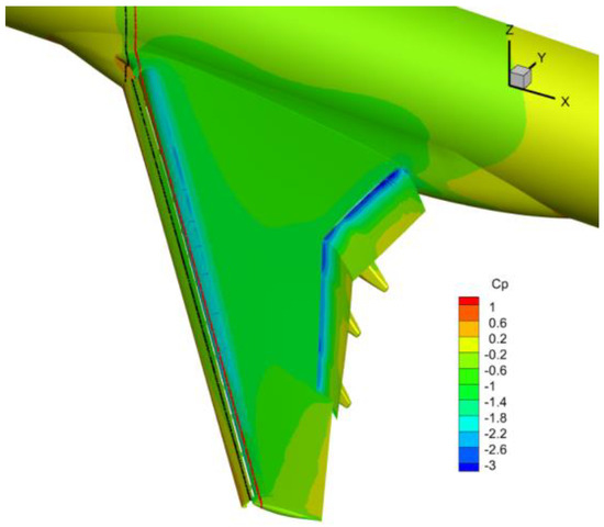 Figure 4 illustrates the distribution of the pressure coefficient across the pressure and suction surfaces of the CRM-HL baseline model. It is evident that the pressure on the pressure surface is notably higher than that on the suction surface. The pressure coefficient reaches its minimum within the slat gap region, primarily attributed to the acceleration of the flow. Conversely, the maximum pressure coefficient is observed on the flap pressure surface of the flap. An analogous pressure distribution was observed on both the pressure and suction surfaces of the CRM-HL modified model.