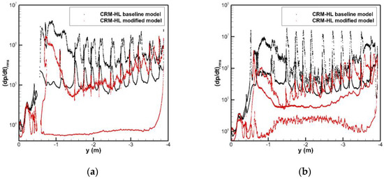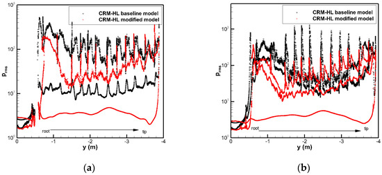Comparison of the spanwise (dp/dt)rms between the CRM-HL baseline model and CRM-HL modified model. (a) The trailing edge of the slat; (b) the leading edge of the main wing.