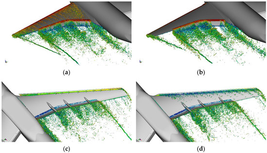 Figure 17 compares the instantaneous vortical structures between the CRM-HL baseline model and the CRM-HL modified model. Specifically, Figure 17a,b offers a top-view comparison, while Figure 17c,d provides a bottom-view comparison. A notable observation is that the vortical structures present on the upper surface of the wing in the baseline model were effectively mitigated by the introduction of the SGF in the modified model. Additionally, the vortexes within the slat cove were weakened and exhibited a shift from the inboard to the outboard direction due to the presence of the SGF. These findings suggest that the SGF plays a pivotal role in modifying the vortical dynamics of the wing, potentially leading to noise reduction.