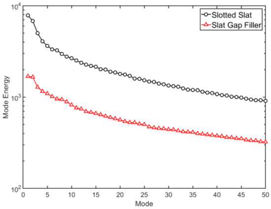 In the study, the simulated pressure field data were employed to derive the dominant modes utilizing the POD method. Figure 20 depicts the distribution of the eigenvalue corresponding to each mode, clearly indicating a significant and rapid decline in these values. When compared to the CRM-HL baseline model, the modified CRM-HL model exhibited a substantial reduction in the energy associated with each mode.