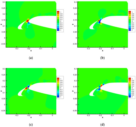 Figure 7 presents a comparative analysis of the surface pressure distribution across eight distinct cuts on the wing, as previously depicted in Figure 5. This comparison highlights the profound impact of the SGF on the pressure distributions within the slat region. Particularly, the implementation of the SGF significantly reduces the pressure on the slat suction surface, while simultaneously enhancing the pressure on the pressure side. This combined effect is anticipated to contribute to an enhancement in lift within the slat region. Furthermore, the introduction of the SGF is observed to elevate the pressure on the suction side at the main wing’s leading edge, resulting in a reduction of the lift coefficient. Nevertheless, it is noteworthy that the pressure distribution across the flap region remains largely unaffected by the inclusion of the SGF. Table 1 presents the impact of the SGF on global aerodynamic performance, summarizing lift coefficients, drag coefficients, and lift-to-drag ratio. The results indicate that the SGF device slightly increased the lift coefficient while decreasing the drag coefficient, consequently enhancing the lift-to-drag ratio. These findings offer valuable quantitative evidence for understanding the aerodynamic consequences of the SGF on wing performance.