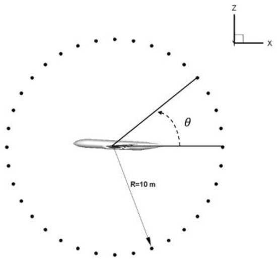 One of the primary objectives of the present research is to evaluate the efficacy of the SGF in mitigating noise levels on practical aircraft configurations. This section specifically aims to conduct a rigorous assessment of the airframe noise reduction by the SGF. To accurately compute the directivity of the airframe noise, a total of 36 microphones, as illustrated in Figure 23, were positioned in the vicinity of the CRM-HL model. These microphones are placed at a distance of 10 m from the aircraft’s center, representing the far-field measurement points. The sampling frequency was 50 kHz with a sampling time of 0.08 s. Moreover, the far-field sound pressure data were processed using the pwelch function and divided into eight segments for the power spectrum. A Hanning window was used to handle each data segment with an overlap of 50%.