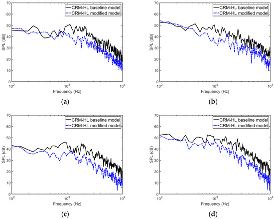 Figure 24 presents a comparison of the far-field airframe noise spectra between the CRM-HL baseline model and the CRM-HL modified model at four different polar angles. It is evident that the airframe noise spectra exhibit a broadband nature. Specifically, Figure 24a compares the airframe noise spectra at a polar angle of 0 degrees. The far-field airframe noise spectrum for the CRM-HL modified model is notably lower than that of the CRM-HL baseline model within the high-frequency domain above 1000 Hz. Significantly, the SGF reduces the broadband airframe noise by approximately 10 dB, consistent with previous experimental observations for SGF [36,45]. However, at low frequencies, the airframe noise reduction by the SGF is negligible.