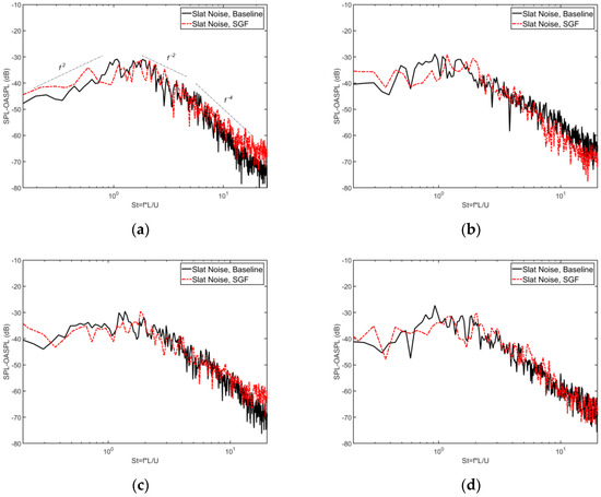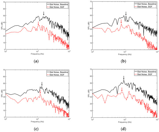 A similar pattern is observed in the comparison of the far-field airframe noise at the polar angle of 90 degrees, as shown in Figure 24b. The SGF reduces the airframe noise by about 10 dB in the high-frequency domain. This trend is also obvious in the comparisons at polar angles of 180 and 270 degrees, as displayed in Figure 24c,d, respectively. Overall, the analyses indicate that the SGF is an effective noise reduction technology, particularly for middle and high-frequency noise.