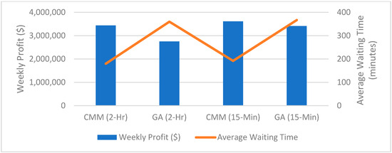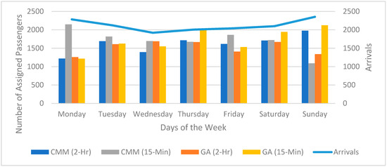 The mathematical model aims to maximize profit by fares from assigned passengers, while deducting spill, operating, and waiting costs, as shown in Equation (1). The passenger waiting cost is calculated by multiplying the number of assigned passengers by their corresponding waiting time at the hub based on piecewise cost function. Equation (2) ensures that the total passenger demand equals the sum of the assigned and spilled passengers. Equations (3)–(5) specify aircraft opening conditions. Equation (3) ensures that at most one flight can be opened during each phase. Equation (4) prohibits any aircraft from being opened before the designated start time for that phase. Equation (5) prohibits any aircraft from being opened after the designated end time for that phase. Equations (6)–(8) address aircraft capacity and demand conditions. Equation (6) ensures that aircraft capacity is not exceeded when assigning passengers in any phase. Since only one aircraft can be opened per phase, as specified by Equations (3)–(5), it is automatically satisfied for whichever aircraft is selected. Equation (7) prevents passenger assignments after a flight’s departure and links passengers only to scheduled flights. Equation (8) connects flight “opening” to passenger assignments by requiring at least one passenger to be assigned if the flight is opened. Equations (9)–(20) calculate the waiting time and associated costs. Equation (9) returns the departure time of an open flight in phase h. Equations (10) and (11) ensure that passengers are not assigned to flights if their waiting time at the hub exceeds the maximum allowable limit. Equations (12) and (13) permit passenger allocation only after the defined ready time has elapsed. Equation (14) enforces that the waiting time does not exceed its maximum allowable time. Equation (15) keeps the waiting time within valid bounds and prevents negative waiting times if a flight departs before the passenger arrives. Equation (16) calculates the waiting time for passengers arriving at time t in phase h and assigned to a departing flight in the same phase; it returns zero if the passenger’s arrival occurs after the flight’s departure. Equation (17) determines the total wait time for those passengers. Equations (18) and (19) use a piecewise linear cost function to calculate the waiting cost, and Equation (20) sums the waiting cost for passengers assigned to flights that depart at time p and arrive at time t. Equations (21)–(27) govern passenger flow from Day 1 to Day 7, ensuring that arriving passengers are either allocated to flights or spilled. These constraints balance passenger flow so that inflows match outflows daily, and they also account for carryover passengers, assigned passengers, and spilled passengers. Equations (28)–(32) are passenger assignment constraints. Equation (28) calculates the number of spilled passengers arriving before the transfer threshold Q. Equation (29) calculates the number of spilled passengers arriving after Q. Equation (30) computes the number of carryover passengers arriving on Day g and assigned to a flight on Day g+1. Equation (31) calculates the total number of assigned passengers on Day 1, while Equation (32) calculates the total number of assigned passengers on subsequent days. The distinction between the first day and the rest of the weekdays is necessary, because no carryover passengers can exist before Day 1. Equations (33)–(35) define timetable metrics to evaluate solution quality. Equation (33) calculates the total waiting time of assigned passengers across the week. Equation (34) counts the total number of assigned passengers during the week, while Equation (35) determines the total number of spilled passengers during the week. Finally, Equations (36)–(42) are sign constraints.