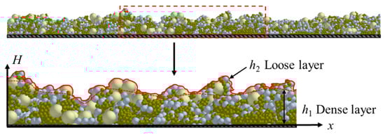 Based on the scanning image of the surface morphology of the particle deposition on the flat plate [26], it can be noticed that the fouling increases the non-uniform thickness of the flat plate and the irregular surface roughness. To characterize the fouling, some spherical particles with random diameters are used to describe the distribution and morphology of the flat plate fouling as shown in Figure 1. In general, with the accumulation of time and the pressure of the airflow during the deposition of particles, a relatively dense fouling layer must be formed near the wall first. With the increase in time, the thickness of the dense layer gradually increases, and there is always a relatively loose particle layer in the outermost layer. Therefore, the fouling is classified into a dense layer and a loose layer by sufficiently considering the fouling distribution characteristics in the normal direction of the flat plate, which represent the non-uniform thickness and rough structures of the fouling, respectively. Therefore, fouling can be calculated by the following equation: