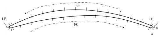 To model the uncertainty in the thickness of the dense fouling layer, it is fundamental to calculate the disturbance values of the thickness of the dense fouling layer, in particular, the number of control point positions x determines the dimension of the modeling. Among them, the position diagram of the control point is shown in Figure 2. The positions of the control points on the blade arc are marked with short lines, and the leading edge is written as LE, suction surface is marked as SS, trailing edge is marked as TE, and the pressure surface is marked as PS. For this study, the blade arc is separated from the trailing edge point along the arc and the position of each control point is normalized in the direction of the trailing edge, suction surface, leading edge, and pressure surface. And s is the total length of the blade arc.