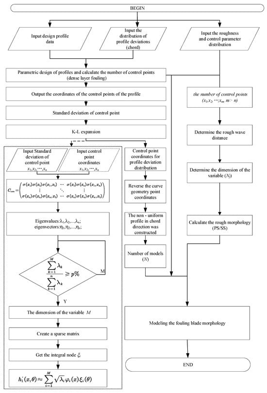 The key to establishing the geometric uncertainty model for compressor blade fouling lies in the appropriate characterization of dense fouling layer distribution and loose fouling layer morphology. For focused investigation, geometric uncertainty models for the dense fouling layer and the loose fouling layer are developed separately, with specific modeling steps detailed in Figure 3. The dotted line in the flowchart represents the process of K-L expansion. After the K-L expansion is completed, the thickness of the dense layer fouling will be obtained.