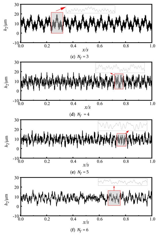 Figure 5 shows the effect of on the rough structures at Ra = 20 µm. It can be found that the rough structures have obvious periodic characteristics when = 1 and 2, which is not consistent with the irregular rough structures that need to be established in this study, so it is not considered. The periodicity of the rough structures is weakened when = 3, it is noted that the periodicity still exists through the local magnification. However, the roughness is no longer periodic when = 4, and the waveforms composed of the roughness features begin to have skewed features, and as increases to 5, the irregular roughness features become more obvious, and the skew of the waveform further increases. However, when is increased to 6, although the constructed rough structures have irregular rough features, it can be found that the features of the rough structure are only different from the amplitude and phase when = 5 by the local magnification of the figure. It indicates that increasing is not beneficial for obtaining more abundant waveforms, while increasing the dimension of independent variables leads to increased computing costs. Therefore, = 5 is the minimum value to characterize the rough structures of the loose fouling layer.