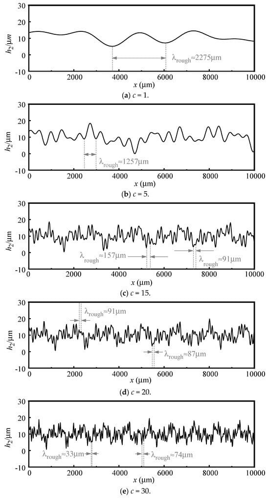 To characterize the uncertainty of the rough structures, a standard normal distribution is used to randomly generate ϵ. When is determined, the parameter ωn can be regulated to achieve the rough structures of the loose fouling layer with different wave distances, which will be directly influenced by the coefficient c, as shown in Equation (12). While ϵ is constant, the greater c is the rougher the calculated loose fouling layer morphology, and the higher the roughness frequency the smaller the wave distance. The selection of parameter c must take into account the size range of the particles (0–20 μm) forming the fouling [14] and the richness of the rough structures. The effect of the coefficient c on the wave distance of the rough structures is given in Figure 6 while Ra = 20 μm. What is most obvious is that the wavelength λrough of the rough structures decreases as c increases, and the more abundant the rough features are from Figure 6a–e.