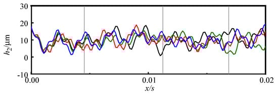 Figure 7 shows the influence of the skew direction control parameter on the rough structures, and the lines with different colors represent the rough structures of the loose fouling layer established by different parameters of Gaussian distribution. It can be found that the effect of changing on the roughness and the wavelength λrough of the rough structures is not significant when other parameters are constant. Three gray lines perpendicular to the x-axis have been drawn at each of the three positions in Figure 7 to observe more clearly the effect of the random variation of the parameter on the skewness of the rough structures at the same position. It can be found that the skewness of the rough structures is completely different for different values of the parameter a at the same position. Therefore, it is possible to construct a model of a loose fouling layer with random morphology by modulating the skew direction control parameter when the other control parameters are consistent. In addition, the variation of affects the roughness within ±1 μm when other control parameters are conserved constants, which is within the viscous sublayer of the compressor blade flow field and has almost no effect on the flow field.