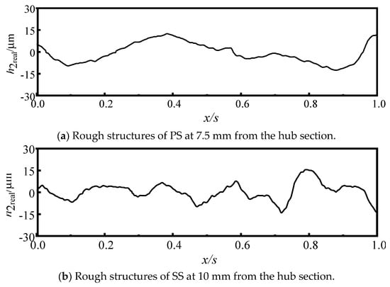 A set of rough structures scans of real compressor blade fouling is employed as a standard for calibrating the FLH model, and the specific rough structures of fouling [13] are shown in Figure 8. The fouling rough structures at different cross-sections and locations are chosen, and Figure 8a shows the rough structures of PS at 7.5 mm from the hub section, and Figure 8b shows the rough structures of SS at 10 mm from the hub section. Then, the FLH model is employed to construct the rough structures of the loose fouling layer shown in Figure 8.