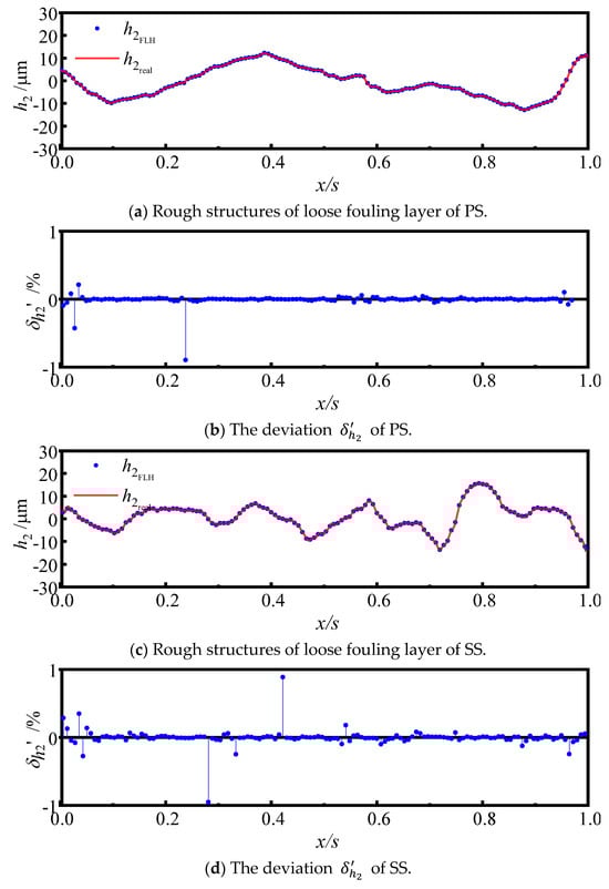 The iterative method is used to solve the loose layer fouling thickness in the FLH model until the deviations are sufficiently small and adequate to characterize the rough structures. The specific calculation results are shown in Figure 9. The blue dots are the fouling roughness data simulated by the FLH model, and the red line is the roughness of fouling on a real compressor blade as shown in Figure 9a,c. It can be found that the FLH model can better simulate the rough structure characteristics of fouling on compressor blades and different rough structures can be simulated at different locations through continuous iteration. Moreover, it can be better characterized by the roughness, skewness, and other features of the real fouling morphology. Similarly, the deviation of the fouling rough structures simulated by the FLH model is demonstrated in Figure 9b,d, with the blue dots being the percentage deviation. It can be noted that the deviation of the fouling rough profile is within ±1% for both simulated PS and SS.