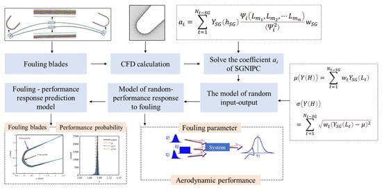 The specific quantitative method and process of the aerodynamic performance of the fouling blade are shown in Figure 10. Firstly, the fouling model established in Section 2 is divided into grids and CFD is invoked for calculation. Based on the CFD calculation results, extract the main aerodynamic performance parameters of concern and substitute them into the formula to solve the coefficient ai of SGNIPC. When the coefficient ai is solved and substituted into Formula (19), the mean and standard deviation of the aerodynamic performance parameters of the fouling cascade can be obtained. Therefore, the correlation model between the random fouling parameters and the aerodynamic performance response has been established. Finally, based on the established model between random fouling and aerodynamic response, the aerodynamic performance degradation of fouling compressor blades can be predicted.