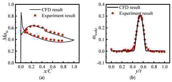 Comparison between experimental and CFD results at i = 0° and Ma = 0.5. (a) Axial normalized chord length versus isentropic Mach number. (b) Axial normalized chord length versus exit loss coefficient.