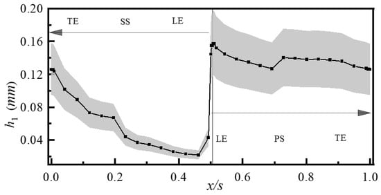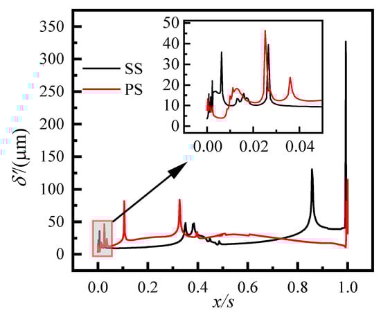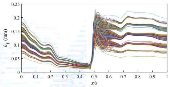 From the above, the uncertainty model of the loose fouling layer with Ra = 50 μm is constructed in this paper, as shown in Figure 19. The relative value h2c range of the roughness of the loose layer fouling is 0 to 0.01424. To characterize the rough morphology of the fouling, a total of 7375 points were selected on the arc length of the blade as modeling variables. Among them, the maximum distance between two points on the arc length was 19 μm, which was sufficient to characterize the rough morphology of the peaks and troughs on the surface of the fouling blade, and different colors represent the different fouling morphologies.