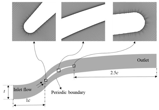 The SST turbulence model coupled with the γ-Reθ transition model has to ensure the y + <1. Based on the above turbulence model, the extension distance of upstream and downstream is 1.0 axial chord length and 2.5 axial chord length, respectively, as shown in Figure 21. The inlet boundary condition is given by the inlet total temperature and pressure, the outlet boundary condition is given by the mean static pressure, and the corresponding Mach number is achieved by adjusting the outlet static pressure. The inlet turbulence intensity is specified at 5%, the walls are treated as adiabatic no-slip walls, the working fluid is an ideal gas, and its compressibility is accounted for.