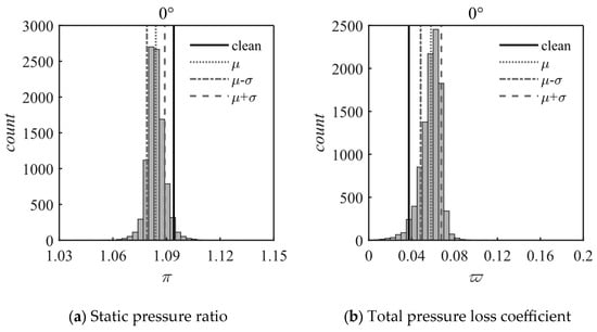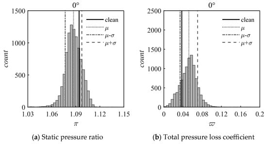 Numerical simulations are carried out based on the uncertainty model of the dense fouling layer thickness established in Section 4 for the case of Ma = 0.5, i = 0°, and the coefficients of NIPC are calculated based on Equation (19). The probability density distribution of aerodynamic performance under the influence of the uncertainty of the thickness of the dense fouling layer is also calculated using 104 Monte Carlo results, as shown in Figure 22. It should be noted that the histograms of the frequency distributions of the static pressure ratio and total pressure loss coefficients show peaked or skewed characteristics, which are quite different from the Gaussian distribution of the input variables. Compared to the clean blade, the mean value of static pressure ratio is reduced by 0.65% and losses are increased by 39.81% due to the dense fouling layer at Ma = 0.5, i = 0°. In addition, it can be found that the uncertainty of dense fouling layer thickness makes the probability of aerodynamic performance 75.8% lower than that of a clean blade.