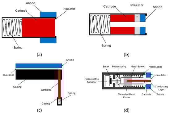Schematics of cathode feed systems on a VAT: (a) spring feed system for a coaxial VAT; (b) spring feed system for a ring VAT; (c) side feed system for a planar VAT; (d) in-screw feed system using a piezoelectric actuator (adapted from [13]).