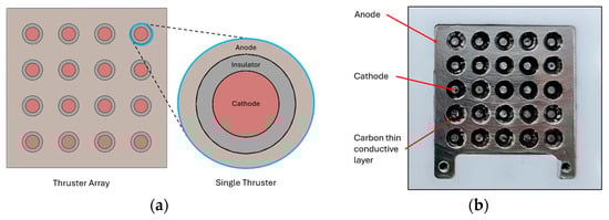 All-printed propulsion system (ALPS) developed by the University of Southampton, a cluster of thin-layer VATs: (a) schematic of a thruster array; (b) picture of the assembled ALPS thruster.