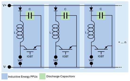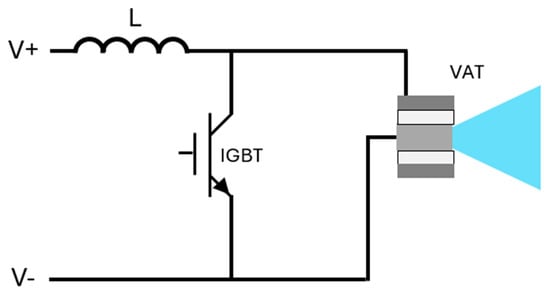 Figure 4 illustrates a schematic of an inductive energy storage PPU, originally devised by [20], specifically designed for operating a triggerless VAT. In this system, a voltage spike is generated by passing current through an inductor and then rapidly halted. This process is controlled through the operation of an insulated-gate bipolar transistor (IGBT), depicted in Figure 4. The voltage spike is produced in accordance with the inductor voltage–current relationship: