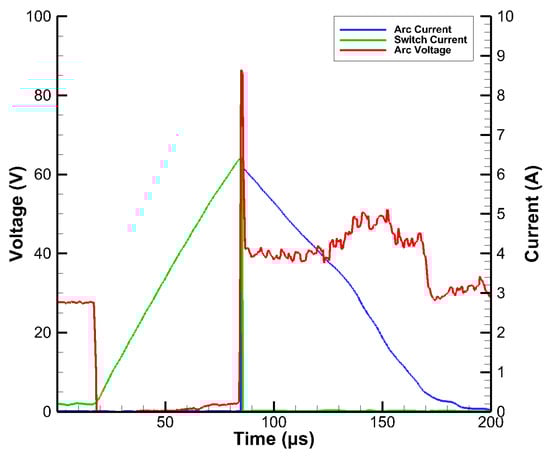 where V is the voltage across the inductor, L is the inductance of the inductor, I is the current through the inductor, and t is time. The sudden voltage spike initiates the ignition of the triggerless VAT, leading to the formation of the vacuum arc. The vacuum arc is then sustained by the current passing through the inductor and naturally terminates once the inductive energy is depleted. The resulting pulse profile generated by the PPU is shown in Figure 5.