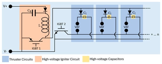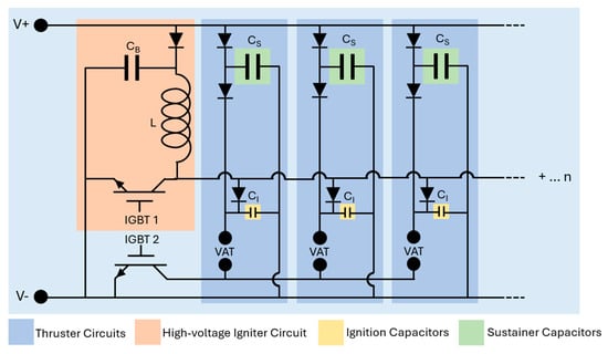The sustainer capacitors can be of any desired capacitance, and the ignition capacitors are functional at 0.1 µF capacitance and voltage ratings of ~500 V, available on the millimetre scale with ceramic designs. The inductors and IGBTs (which also require an associated gate driver) are therefore the larger components in this design. The proposed PPU layout can operate a VAT array with a single inductor and two IGBTs, whereas simultaneous thruster operation with a standard PPU layout requires an inductor and IGBT per VAT, as previously illustrated in Figure 6. Variations in this PPU concept can be tailored for specific propulsion applications, such as low energy and precision impulses.