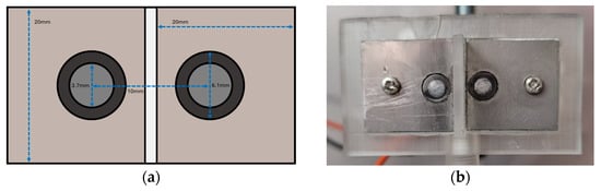 Cathodes were manufactured from zinc rods filed to the required diameter for a tight fit with the insulators, which were cut from 6 mm diameter alumina tubes. The anodes were waterjet cut from a 3 mm stainless steel plate, and holes were drilled with a 6 mm drill bit for a good fit with the insulators. The main array structure was composed of 3D-printed resin using clear resin and a Formlabs Form 3+ 3D printer. All components were secured to the 3D-printed structure with resin. Graphite was applied to the insulator surface with a pencil to form a thin conductive layer of approximately 5 kΩ inter-electrode resistance. Electrical connections were achieved with solder joints to the cathodes and screw terminals to the anodes. Additionally, in this study, a thruster divider of dimensions 20 mm × 10 mm (not easily visible in the figure) was incorporated into the 3D-printed structure to prevent inter-thruster interactions.