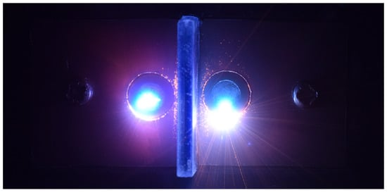 Visible cathode spot formation operating on the high-voltage capacitors demonstrates the successful operation of the thrusters using the compact array PPU architecture. However, at a discharge energy of 4 mJ (corresponding to 0.1 µF capacitance at 200 V), reliability issues were encountered, as demonstrated in Figure 16d, which shows that the left-hand thruster failed to ignite. This is consistent with the reliability data presented in Table 2 for the VAT array PPU. As plasma formation by the ignition capacitors is required to initiate the discharge of sustainer capacitors, the reliability results presented in Table 2 also apply to the compact array PPU configuration. The noticeably brighter triggerless ignition sites observed with decreasing voltage in Figure 15 and Figure 16 may also indicate increased energy dissipation in the thin conductive layer at lower pulse energies, which could negatively impact thruster efficiency.