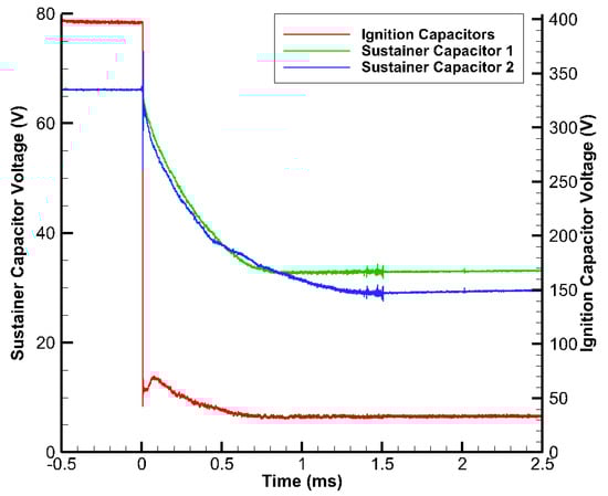 Varied inductor charge times were used to generate a range of ignition voltages from 200 V to 500 V in increments of 100 V. These ignition voltages span the range typically required for triggerless VAT ignition and were found to be capable of producing reliable thruster operation. Ignition capacitor capacitance varied between 0.1 µF and 0.22 µF to assess minimum ignition energy requirements. These capacitances were chosen because, combined with the voltages assessed, the associated energies span the range of reliable and unreliable thruster ignition, allowing the minimum required ignition energy for reliable operation to be assessed. For each ignition capacitor’s voltage and capacitance, 10 array pulses were executed. Reliability was assessed based on the number of successful discharges, defined as cases where the sustainer capacitor discharged by more than 20%, as this indicates substantial energy dissipation while providing a margin for expected random variations in VAT pulses.