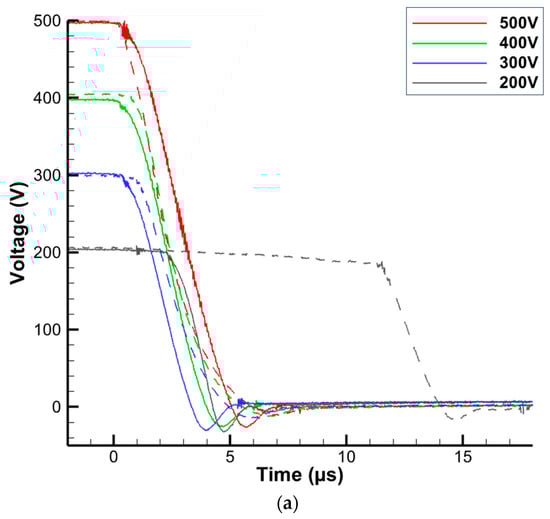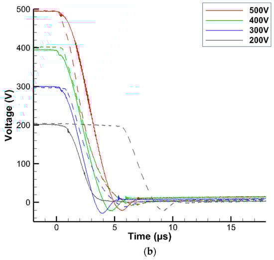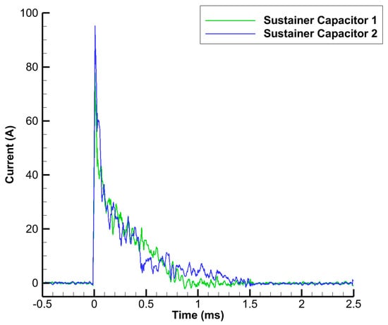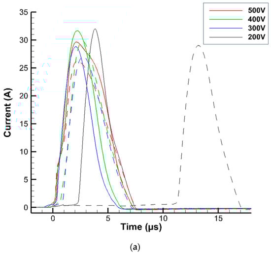 Figure 13 illustrates capacitor discharge times on the order of 3–5 µs, compared to approximately 1.5 ms for sustainer capacitors, representing up to ~500× reduction in pulse duration. The discharge times of the 0.22 µF and 0.1 µF capacitors were similar, with some pulse-to-pulse variation. The current profiles shown in Figure 14 indicate that the peak discharge current generally increased with discharge voltage, though not in all cases. Discharge current was measured using Pearson 6000 series inductive current probes (Pearson Electronics, Palo Alto, CA, USA). The voltage and current profiles for 200 V capacitors show a varying delay in the discharge onset from the pulse initiation, particularly significant for 0.1 µF capacitors.